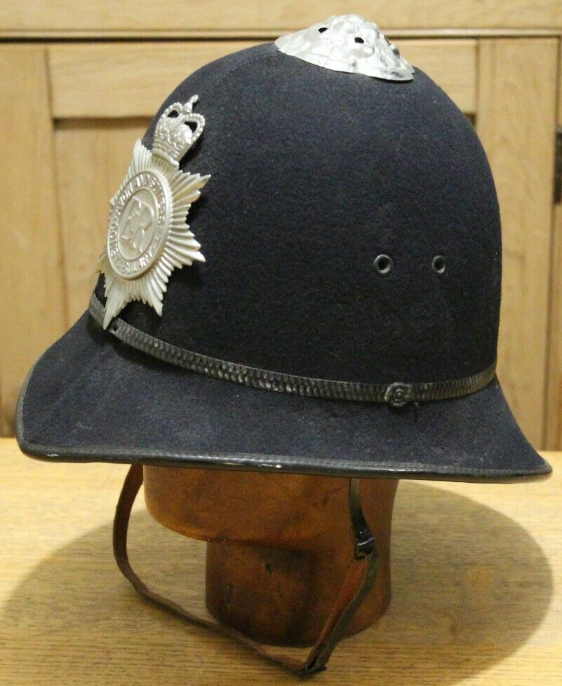 Some years ago, any Avon & Somerset Police helmet listed on eBay which resembled their current issue helmet, was removed by eBay. It could be argued that this example is now obsolete since all newly issued helmets have a silver metal band around the outside. Having said that, there are, and will be plenty of these earlier versions with black band still in Police service for years to come.